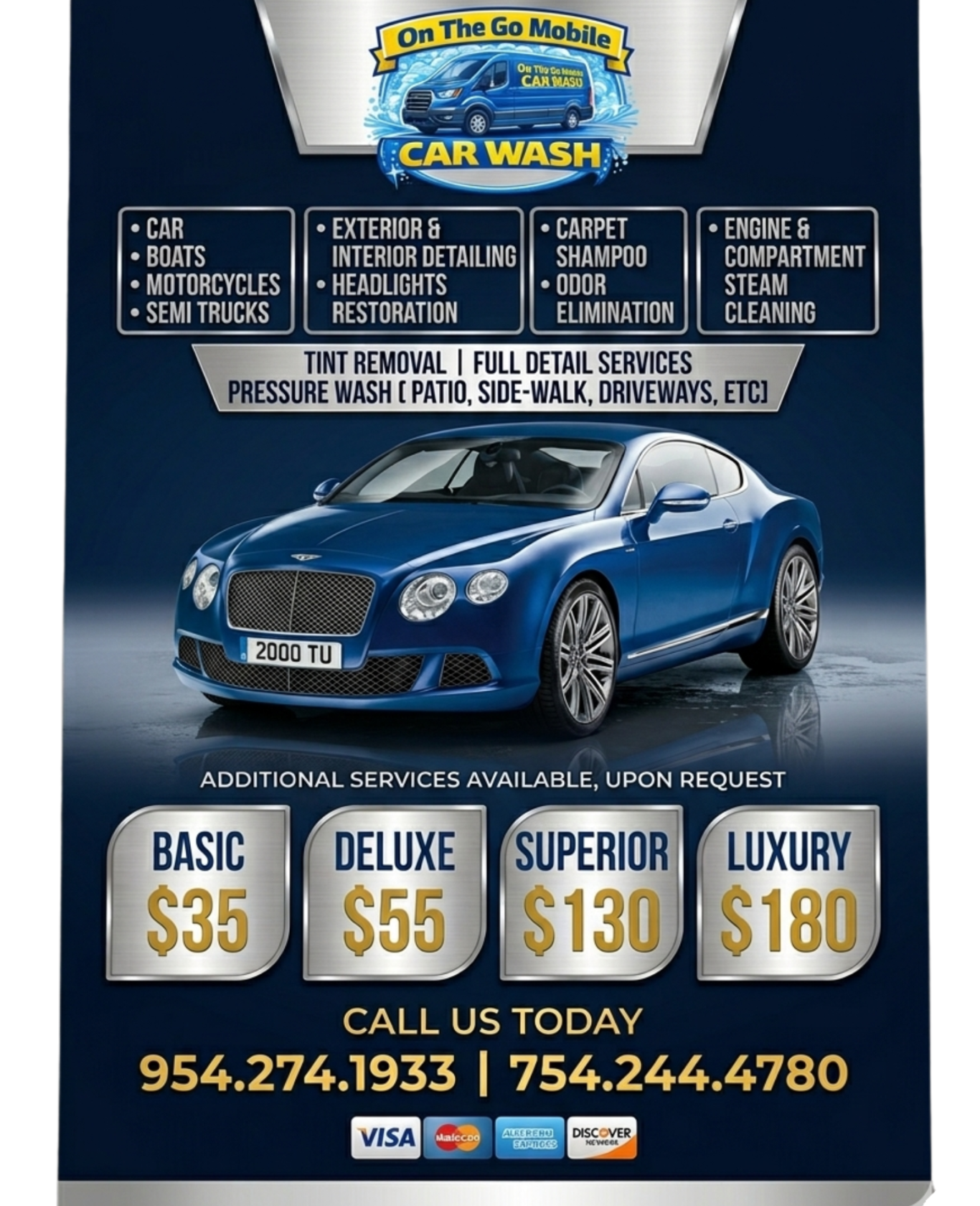 We offer specialized cleaning including waxing, vacuuming, rim and carpet cleaning, odor elimination, and steam engine detailing. Pressure washing for patios, sidewalks, and driveways is also available to keep your property pristine.